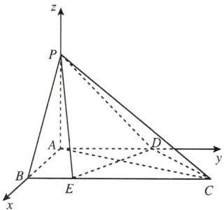 如图,以$A$为原点,以$AB$,$AD$,$AP$所在直线分别为$x$轴、$y$轴、$z$轴,建立空间直角坐标系。