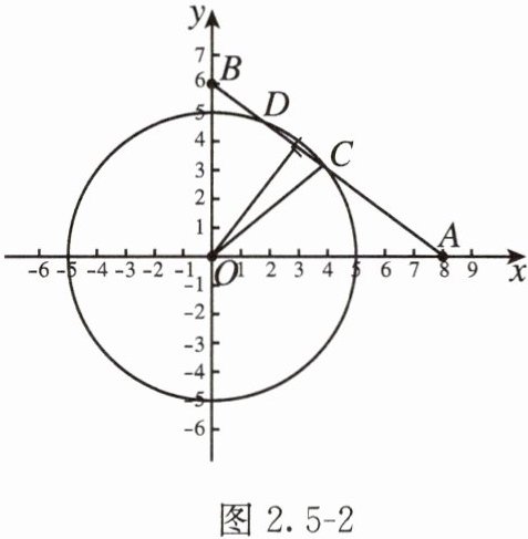 解:记海监船位置为 $ O $. 如图 2.5 - 2,以点 $ O $ 为原点,海监船的正东方向为 $ x $ 轴的正方向,正北方向为 $ y $ 轴的正方向建立平面直角坐标系(1 个单位长度代表 $ 10 $ nmile),则 $ A(80, 0) $,$ B(0, 60) $,圆 $ O $ 的方程为 $ x^2 + y^2 = 2500 $,直线 $ AB $ 的方程为 $ \frac{x}{80} + \frac{y}{60} = 1 $,即 $ 3x + 4y - 240 = 0 $.