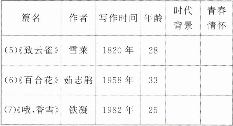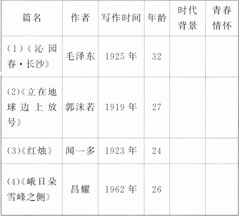 1. 青年总会思索自己与社会的关系,总在一次次思考、实践中完成自我的觉醒。本单元课文的作者创作时都处在青年时期,创作作品的时代背景如何?表现了他们怎样的情怀?请结合课文内容,填写下表。