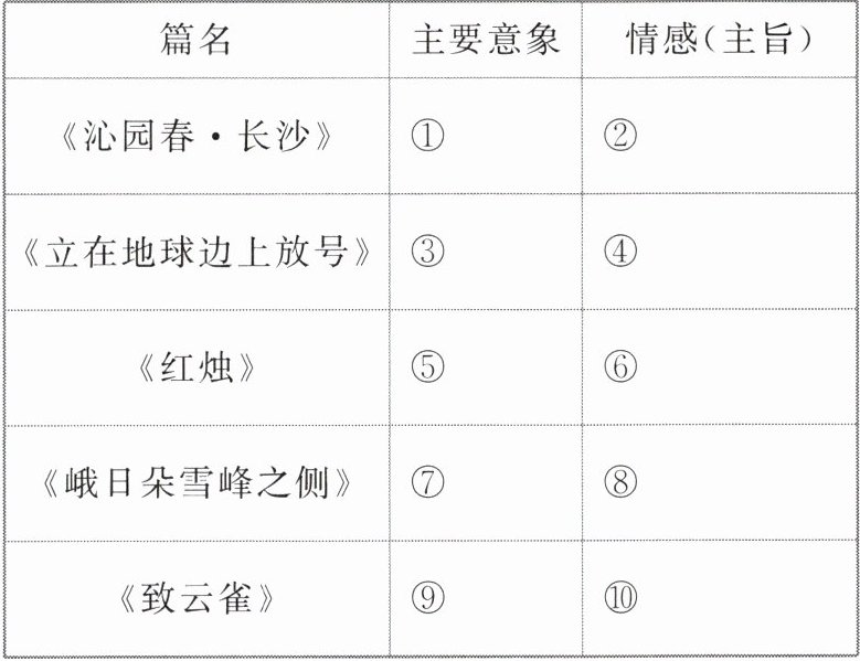4.①寒秋、湘江、万山、层林、江、舸、鹰、鱼、同学少年 ②对寒秋季节万物蓬勃旺盛的生命力的热爱和赞美,雄视天下的凌云壮志 ③白云、北冰洋、太平洋、地球、洪涛 ④自由高阔、积极创造的奋发昂扬精神和热烈向往、执着追求的进取精神 ⑤红烛 ⑥对牺牲和奉献精神的歌颂 ⑦雪峰、太阳、岩壁、蜘蛛 ⑧生命虽卑微、渺小,但依然努力,依然有强劲的生命力的不屈精神 ⑨云雀 ⑩对自由的渴望和对光明的歌颂,体现了为建立理想中的美好世界而勇于献身的崇高精神