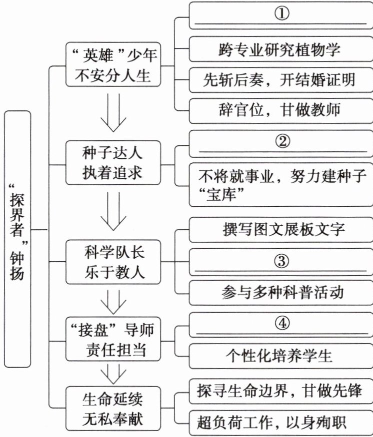 (2)①这一部分写钟扬与父亲赌气而考上中科大少年班;上了少年班后努力补习自己的弱科;无线电专业毕业却进入了植物所工作,他用两年的业余时间旁听武汉大学生物系的课程,从而有了充足的知识储备;面对犹豫不决的妻子,他采用“胁迫”手段与之结婚。可见“英雄”指的是一种勇于向困难挑战、不服输的精神。②作者将结婚这件事放入这一部分,因为在“胁迫”妻子结婚这件事上,同样体现出了钟扬的这种勇于挑战困难、永不服输的英雄精神。