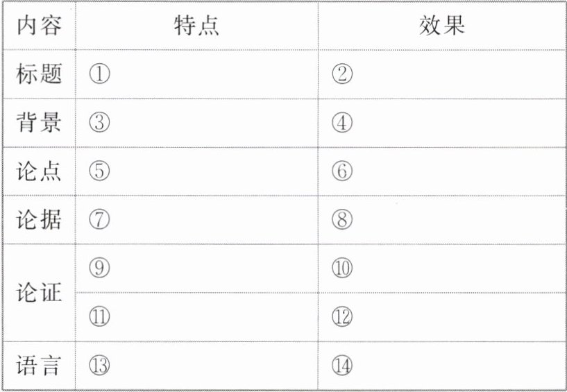 研读此文之后,想必同学们已经明白一篇好的新闻评论,其评价标准应该是怎样的。请各小组将所鉴赏角度进行梳理、归纳、整合,结合文本并联系现实,分别用简要的语言填写下表,共享研读成果。