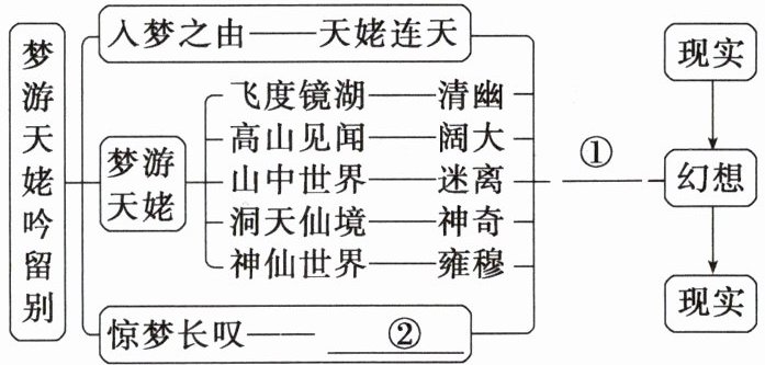 有人说:“文学的深层意义,就是对生命本质的无穷探索。”探索李白的梦境,就是思考李白对生命本质的探索。天姥一梦,实是李白的长安一梦,现实与理想的冲突矛盾,具体而微,都在梦里。请通读全诗,初步感受李白的“梦中”心绪,填出下面结构导图中的空缺部分。