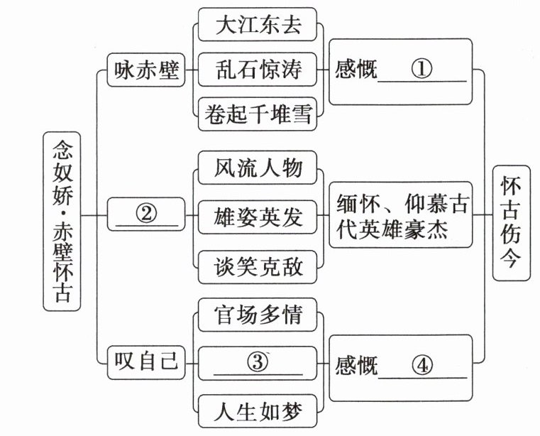 清代文人评东坡词“自有横槊气概,固是英雄本色”。请朗读此诗,初步感知东坡的“英雄本色”,填出下面结构导图中的空缺部分。
