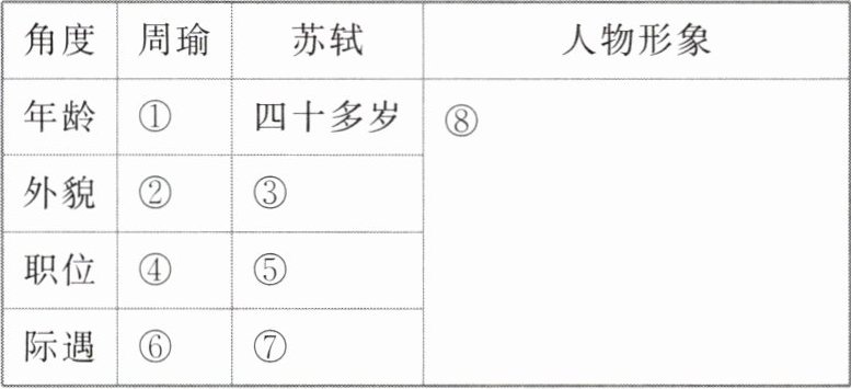 2.①三十多岁 ②英俊儒雅 ③早生华发 ④东吴都督(被重用) ⑤团练副使(虚职) ⑥功成名就 ⑦功业未就 ⑧借年少功成的周瑜衬托出一个多愁善感、被排挤、壮志难酬、悲苦愤懑的白发爱国者形象。
