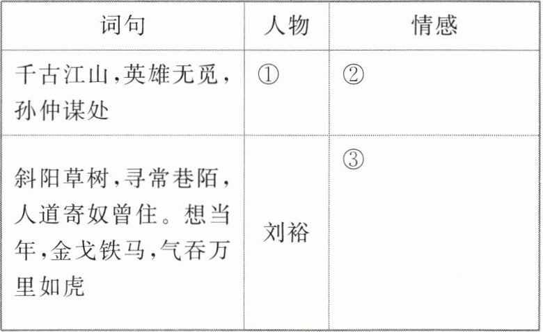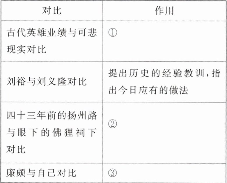 2. (赏析对比手法)《永遇乐·京口北固亭怀古》除了用典外,还运用了对比手法来丰富意旨,委婉深沉地表达情感。请具体体会并完成下表。
