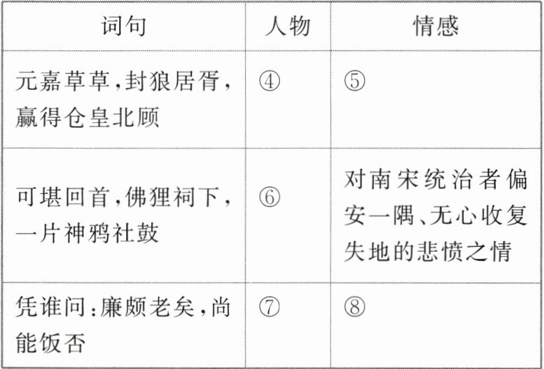 1 ①孙权 ②对江山犹在,而如孙权一样的英雄已不见的惋惜,暗含无人可御外侮之意 ③表达了词人对古代英雄的赞叹之情,也暗含着用英雄们的业绩鼓励、鞭策自己之意 ④刘义隆 ⑤对当时执政者急功近利、主张出兵而不做充分准备的警示 ⑥拓跋焘 ⑦廉颇 ⑧以廉颇自比,表示自己仍能为国效力,同时也抒发了报国无门、壮志难酬之愤