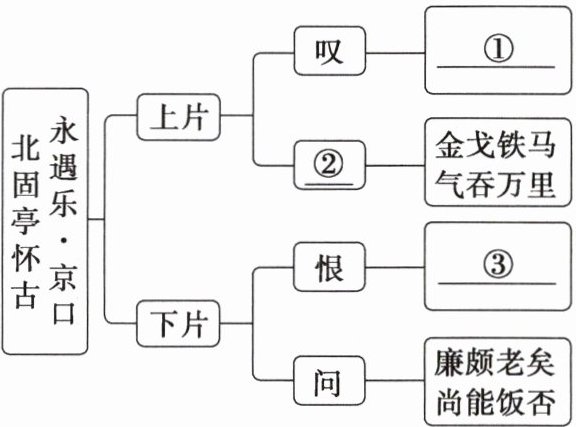 梁衡在《把栏杆拍遍》中说,辛弃疾南归后的40年里,有20年被闲置,在被任用的20年里经历了37次调任。请通读全词,结合辛弃疾生命末期的多次沉浮,初步感受他壮志难酬的悲愤之情,填出下面结构导图中的空缺部分。