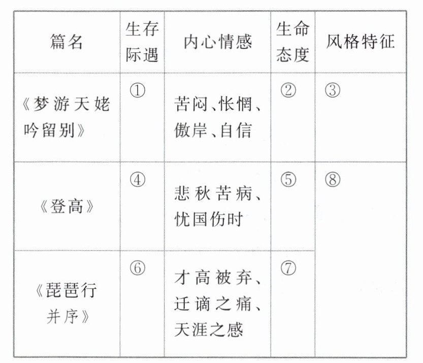 2. 研读《梦游天姥吟留别》《登高》《琵琶行并序》三首唐诗,完成下表。
