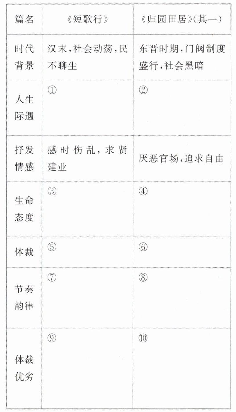 1. 研读《短歌行》和《归园田居》(其一)两首诗,完成下表。