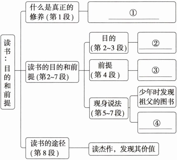 “他那些灵思盎然的作品,它们一方面具有高度的创意和深刻的洞见,一方面象征古典的人道理想和高尚的风格。”这是黑塞的诺贝尔颁奖辞。请通读《读书:目的和前提》,初步感知他的洞见和风格,填出下面结构导图中的空缺部分。