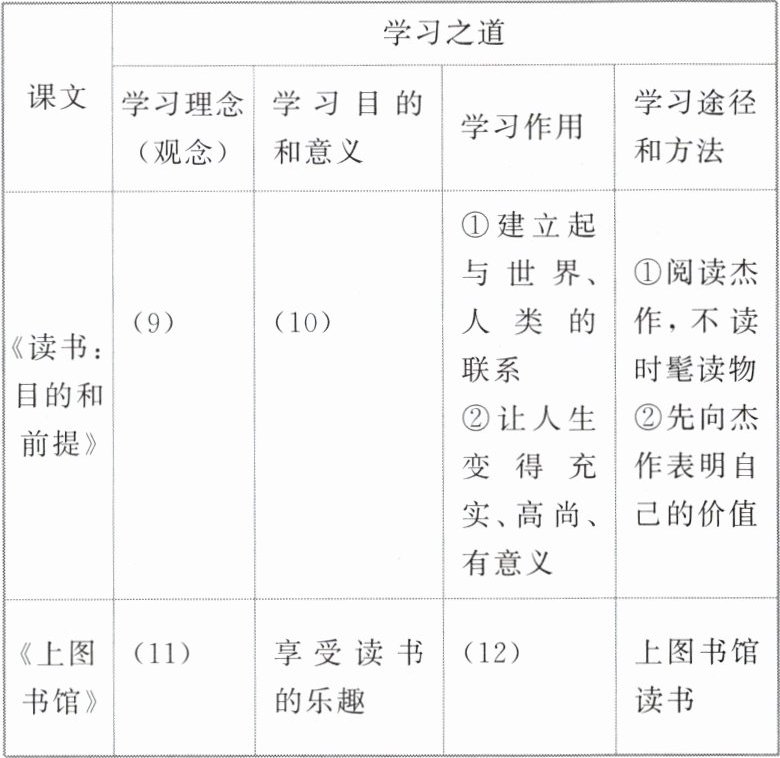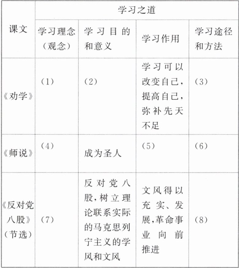1. (梳理“学习之道”)本单元的课文都从不同角度阐述了“学习之道”。试结合课文内容填出下表。