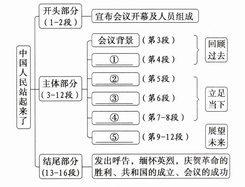 1. (梳理文章内容)这篇开幕词行文严谨,表达严密。再读全文,理清文章脉络,填写下面导图中的空缺部分,并指出“回顾过去—立足当下—展望未来”这三部分之间有怎样的关联。