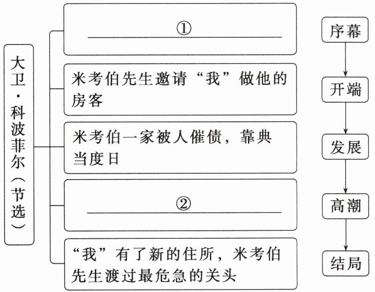 1.①“我”在谋得斯通 - 格林比货行当童工 ②米考伯一家人住进监狱 2.①事:“我”到破败货行当童工,“我”到米考伯家做房客,“我”到狱中探望米考伯。②人:昆宁先生(账房先生)、米克·沃克(童工)、粉白·土豆(童工)、米考伯先生(房东)、米考伯太太(房东太太)、霍普金斯船长(米考伯的牢友)。