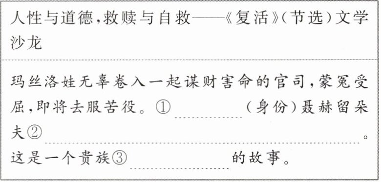 3.①担任陪审员的贵族 ②在法庭上发现玛丝洛娃正是自己年轻时抛弃的姑娘,良心受到谴责,经过痛苦的思想斗争,决定去监狱探望玛丝洛娃,祈求宽恕 ③顿悟觉醒