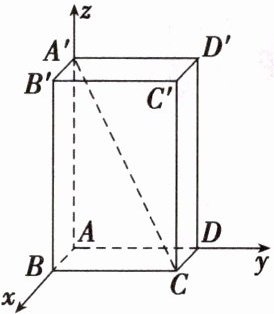 因为AB = 1,BC = 2,AA' = 3,所以A'(0,0,3),C(1,2,0),B(1,0,0),所以直线A'C的方向向量A'C=(1,2,-3)。法一:$BC=(0,2,0),l₀=\frac{\overrightarrow{A'C}}{|\overrightarrow{A'C}|}=(\frac{1}{\sqrt{14}},\frac{2}{\sqrt{14}},-\frac{3}{\sqrt{14}}),$则|BC|$² = 4,\overrightarrow{BC}⋅l₀=\frac{4}{\sqrt{14}},$所以点B到直线A'C的距离为$\sqrt{|BC|² - |\overrightarrow{BC}⋅l₀|²}=\sqrt{4 - \frac{16}{14}}=\frac{2\sqrt{35}}{7}$法二:因为BC=(0,2,0),所以BC在A'C上的投影长为$\frac{|\overrightarrow{BC}⋅\overrightarrow{A'C}|}{|\overrightarrow{A'C}|}=\frac{4}{\sqrt{14}}$所以点B到直线A'C的距离为$d=\sqrt{|BC|² - \left(\frac{|\overrightarrow{BC}⋅\overrightarrow{A'C}|}{|\overrightarrow{A'C}|}\right)^2}=\sqrt{4 - \frac{16}{14}}=\frac{2\sqrt{35}}{7}。$