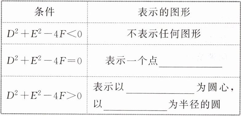 (2)当$D^{2}+E^{2}-4F = 0$时,方程$x^{2}+y^{2}+Dx + Ey + F = 0$表示一个点$(-\frac{D}{2},-\frac{E}{2})$。