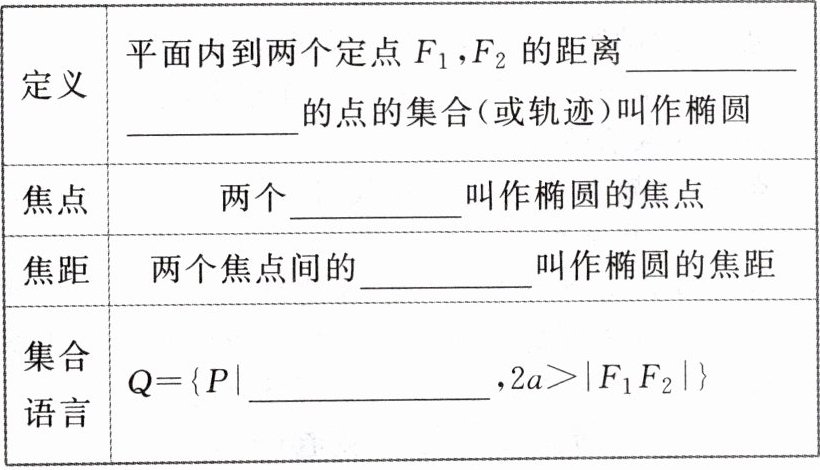 (2)定值必须大于两定点的距离.(3)当距离的和等于$|F_1F_2|$时,点的轨迹是线段.(4)当距离的和小于$|F_1F_2|$时,点的轨迹不存在.