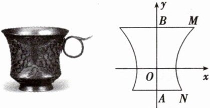 典例 5 如图为陕西历史博物馆收藏的国宝——唐·金筐宝钿团花纹金杯,杯身曲线内收,玲珑娇美,巧夺天工,是唐代金银细作的典范之作. 该杯的主体部分可以近似看作是双曲线 $ C:\frac{x^{2}}{a^{2}}-\frac{y^{2}}{b^{2}} = 1(a > 0,b > 0)$ 的右支与 $ y $ 轴及平行于 $ x $ 轴的两条直线围成的曲边四边形 $ ABMN $ 绕 $ y $ 轴旋转一周得到的几何体. 若该金杯主体部分的上口外直径为 $\frac{10\sqrt{3}}{3}$,下底座外直径为 $\frac{2\sqrt{39}}{3}$,且杯身最细之处到上杯口的距离是到下底座距离的 $ 2 $ 倍,则杯身最细之处的周长为(