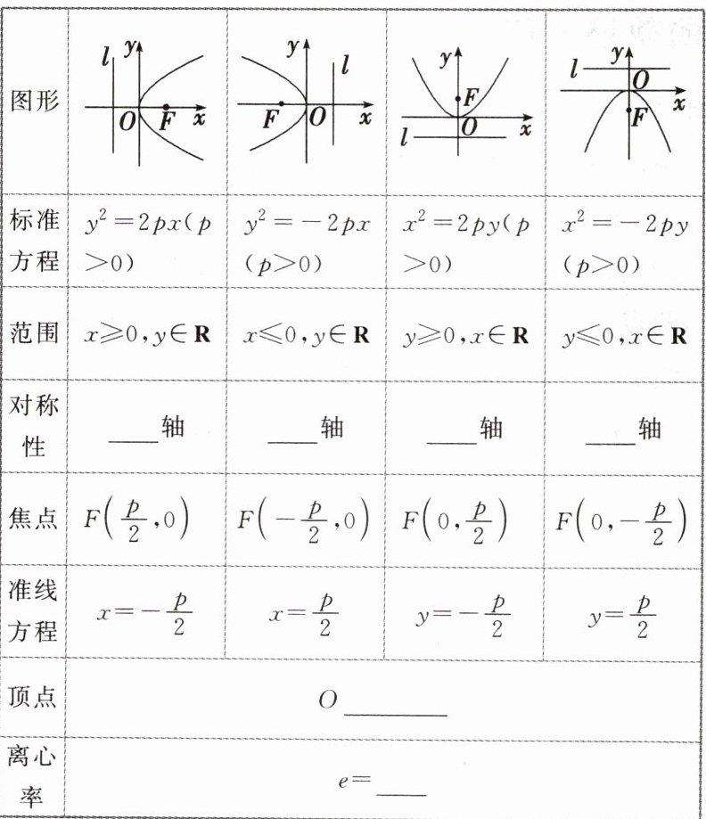 [微提醒] (1)只有焦点在坐标轴上,顶点是原点的抛物线的方程才是标准方程. (2)过焦点且垂直于对称轴的弦称为通径,通径长为 $ 2p $.