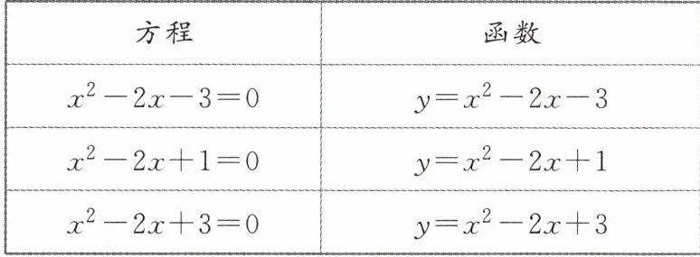 方程$x^{2}-2x-3=0$的根为$-1,3$,函数$y=x^{2}-2x-3$的图象与$x$轴交于点$(-1,0),(3,0)$;方程$x^{2}-2x + 1 = 0$有两个相等的实数根,为$1$,函数$y=x^{2}-2x + 1$的图象与$x$轴有唯一交点$(1,0)$;方程$x^{2}-2x + 3 = 0$没有实数根,函数$y=x^{2}-2x + 3$的图象与$x$轴无交点.