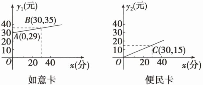 为了发展电信事业,方便用户,电信公司对移动电话采用不同的收费方式,其中所使用的“如意卡”与“便民卡”在某市范围内每月(30 天)的通话时间 $ x $(分)与通话费用 $ y $(元)的关系如图所示.