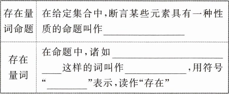[微提醒](1)常见的存在量词还有“对某些”“有的”等.(2)存在量词命题含有存在量词,有些存在量词命题中的存在量词是省略的,理解时需要把它补充出来.