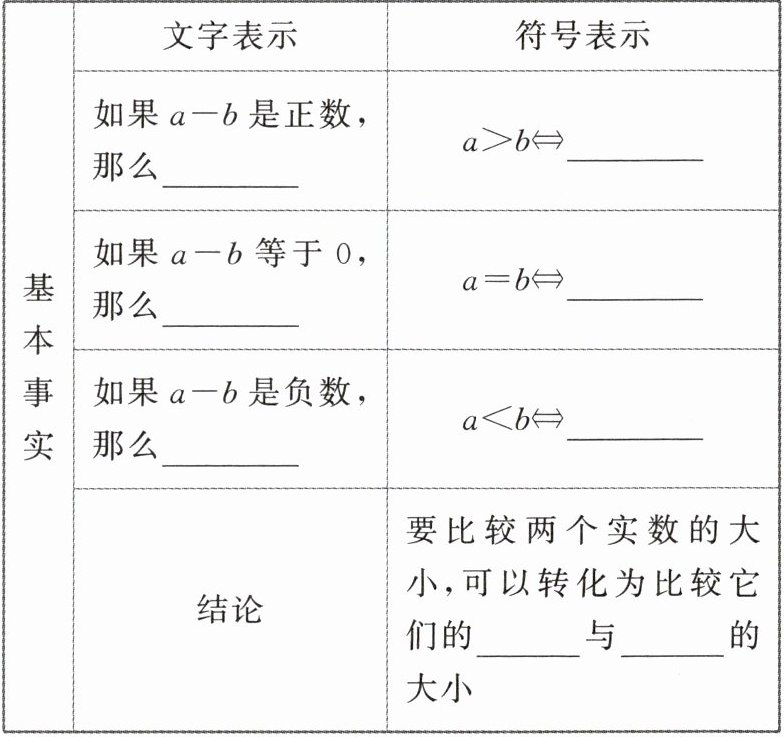 综上,答案依次为:$\boldsymbol{a\gt b}$;$\boldsymbol{a - b\gt0}$;$\boldsymbol{a = b}$;$\boldsymbol{a - b = 0}$;$\boldsymbol{a\lt b}$;$\boldsymbol{a - b\lt0}$;差;$\boldsymbol{0}$。