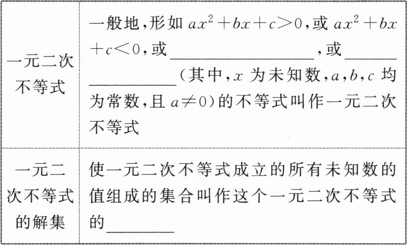 本题可根据一元二次不等式的定义和一元二次不等式解集的定义进行填空。