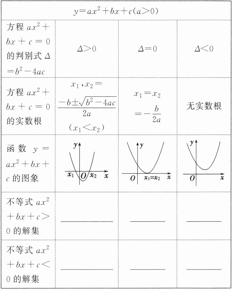 $y = ax^{2}+bx + c(a>0)$的图象与方程$ax^{2}+bx + c = 0$的实数根、不等式$ax^{2}+bx + c>0$和$ax^{2}+bx + c<0$的解集之间的关系: