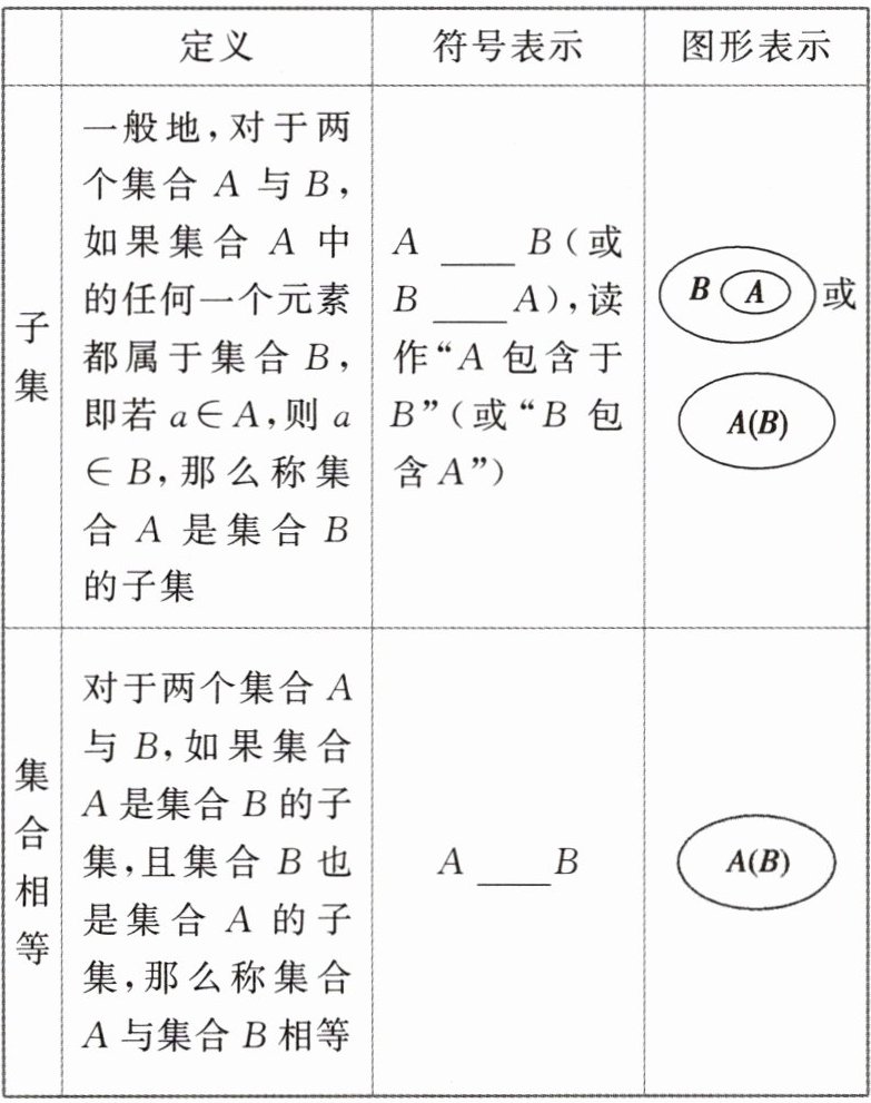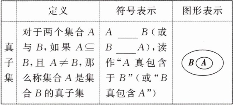 [微提醒] (1) 用 Venn 图表示集合的优点是能直观地表示集合间的关系,缺点是集合元素的公共特征不明显. (2) 在真子集的定义中,$ A $,$ B $ 首先要满足 $ A \subseteq B $,且 $ A \neq B $. (3) 若出现 $ A \subseteq B $ 时,应讨论 $ A = \varnothing $ 和 $ A \neq \varnothing $ 两种情形. (4) 若 $ A \subseteq B $,且 $ B \subseteq C $,则 $ A \subseteq C $.
