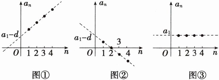 (1) 当$d>0$时,数列$\{ a_{n}\}$为__________数列,如图①所示;