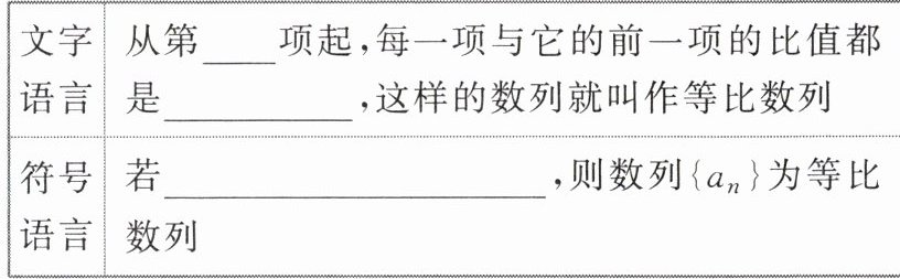 [微提醒] (1) 等比数列定义的符号语言也可以表示为:$\frac{a_{n + 1}}{a_{n}} = q$($q$为常数且$q\neq 0$,$n\in N_{+}$)。(2) 定义中“比值是同一个常数”,不能理解成“比值是一个常数”。(3) 公比可以是正数,也可以是负数,但是不能为0。