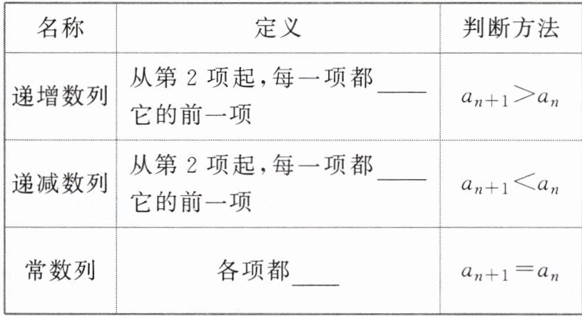 [微提醒] (1)可以用函数的观点、方法研究数列的增减性. (2)一个数列$\{a_{n}\}$,如果从第$2$项起,有些项大于它的前一项,有些项小于它的前一项,这样的数列叫作摆动数列.