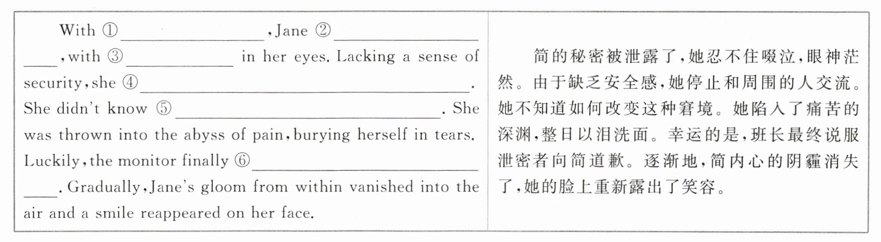 ①her secret leaked ②couldn’t resist sobbing ③a distant look ④ceased communicating with those around her ⑤how to switch the embarrassment ⑥persuaded the leaker to apologize to Jane