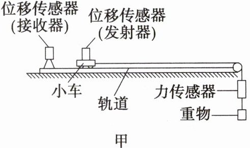 例 3 某实验小组用如图甲所示的实验装置探究加速度与力、质量的关系,重物通过滑轮用细线拉着小车,在小车和重物之间接一个不计质量的微型力传感器,位移传感器(发射器)随小车一起沿水平轨道运动,位移传感器(接收器)固定在轨道一端,实验中力传感器的示数为 $ F $,保持小车[包括位移传感器(发射器)]的质量不变,改变重物的质量重复实验若干次,得到加速度与外力的关系。