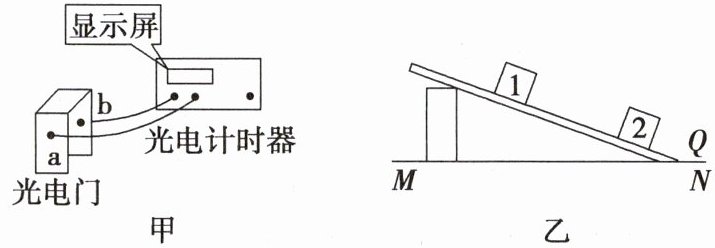 例 3 光电计时器是一种研究物体运动情况的常用计时仪器,其结构如图甲所示,$ a $、$ b $ 分别是光电门的激光发射和接收装置,当有物体从 $ a $、$ b $ 间通过时,光电计时器就可以显示物体的遮光时间。现利用图乙所示装置测量滑块的速度,图中 $ MN $ 是水平桌面,$ Q $ 是木板与桌面的接触点,$ 1 $ 和 $ 2 $ 是固定在木板上适当位置的两个光电门,与之连接的两个光电计时器没有画出。实验时,让带有遮光条的滑块(图中未画出)从木板的顶端滑下,光电门 $ 1 $、$ 2 $ 各自连接的光电计时器显示的遮光时间分别为 $ 1.0 × 10^{-2} \, s $ 和 $ 4.0 × 10^{-3} \, s $。滑块上遮光条的宽度 $ d = 1.010 \, cm $。