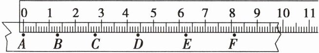 如图所示,某同学用毫米刻度尺进行测量,请帮忙读出 $ B $ 在刻度尺上的位置,填到下表中:
