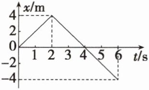 易错点1.AD 开始时质点的位移为零,6s时质点的位移为-4m,则0~6s内质点的位移为-4m - 0 = -4m,故A正确;2s时质点的位移为4m,4s时质点的位移为0,则2~4s内质点的位移为0 - 4m = -4m,故B错误;0~6s内质点的路程为4m + 4m + 4m = 12m,故C错误;$x-t$图像斜率表示速度,2~6s内斜率不变,则2~6s内速度不变,所以2~6s内质点一直向同一方向运动,故D正确。故选AD。