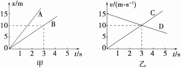 【师生互动】 有四个物体 A、B、C、D,物体 A、B 运动的 $x - t$ 图像如图甲所示;物体 C、D 从同一地点沿同一方向运动的 $v - t$ 图像如图乙所示。完成下列任务:
