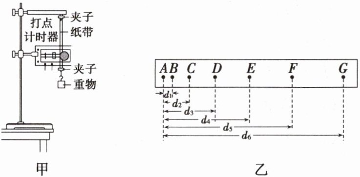 (2) 按正确的操作步骤多次实验后,该同学得到一条点迹清晰的纸带部分如图乙所示,图中 $ A $、$ B $、$ C $、$ D $、$ E $、$ F $、$ G $ 为纸带上相邻的点。则图乙中纸带______(选填“左”或“右”)端与重物相连。