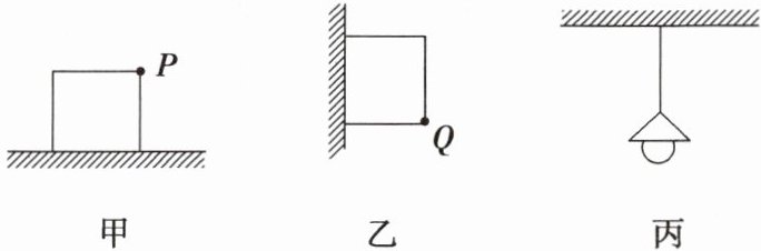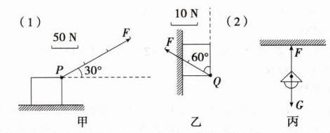 例2 在图甲中木块的$P$点,用与水平方向成$30^{\circ}$角的斜向右上方的$150N$的力拉木块;在图乙中木块的$Q$点,用与竖直方向成$60^{\circ}$角的斜向左上方的$20N$的力推木块使木块静止在墙壁上;图丙中的电灯静止悬挂。