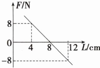 C 由题图可知,当弹簧长度为8cm时,弹力等于零,则弹簧原长为8cm,A错误;弹簧的弹力与弹簧的形变量成正比,B错误;根据F=kΔx,代入题图中数据解得k=F/Δx=8/(0.08-0.04)N/m=200N/m,C正确;由题图可知当该弹簧的弹力大小为8N时,其长度为4cm或12cm,D错误。故选C。