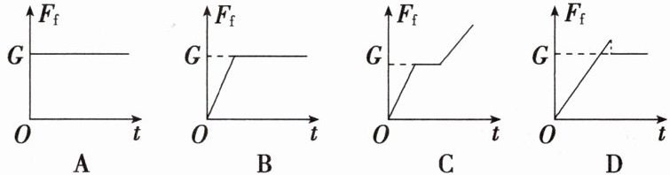D 由于物体所受的水平推力为F=kt,由二力平衡得,墙对物体的支持力$F_{N}=kt。$当$F_{N}$比较小时,物体受到的摩擦力$F_{f}$小于物体的重力G,物体将沿墙壁下滑,此时物体受的摩擦力为滑动摩擦力,大小为$F_{f}=\mu F_{N}=\mu kt;$当摩擦力$F_{f}$等于重力G时,物体不能立即停止运动,物体受到的摩擦力仍然是滑动摩擦力;随着摩擦力的增大,摩擦力将大于重力,物体做减速运动直至静止,滑动摩擦力变为静摩擦力,静摩擦力大小与压力无关,跟重力始终平衡。故选D。