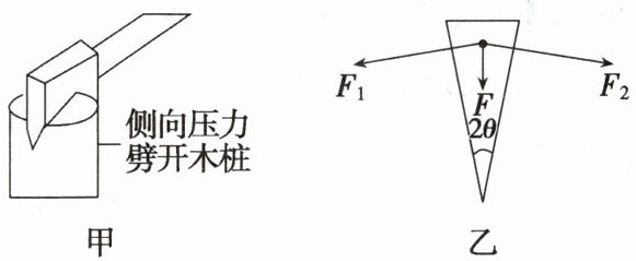 在日常生活中,力的分解有着广泛的应用,如图甲,用斧子把木桩劈开,已知两个侧面之间的夹角为2θ,斧子对木桩施加一个向下的力F时,产生了大小相等的两个侧向分力F1、F2,如图乙所示。下列关系正确的是 ( )