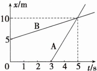 D 5s末A、B到达同一位置,两者相遇,在前5s内,A通过的位移为10m,B通过的位移为5m,A、C错误;A从原点出发,而B从正方向上距原点5m处出发,A在B运动3s后开始运动,B错误;由题图可知,从3s末开始,A、B均沿正方向运动,D正确。故选D。