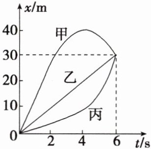 针对练. 甲、乙、丙三个物体同时同地出发,6 s 末同时到达同一目的地,它们运动的位移—时间图像如图所示,则关于三者的路程 $ s $ 和位移大小 $ x $ 的关系,正确的是( )