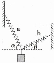 如图,用 a、b 两根轻弹簧吊着重物,静止时,a、b 两弹簧与水平方向的夹角分别为 $ \alpha = 60^{\circ} $、$ \theta = 37^{\circ} $,若 a、b 两弹簧的伸长量之比为 $ 2 : 1 $,两弹簧在弹性限度内,$ \cos 37^{\circ} = 0.8 $,则 a、b 两弹簧的劲度系数之比为( )