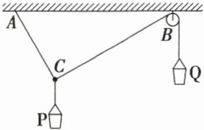 将沙桶 P 用细绳系在 C 点,如图所示,在两沙桶中装上一定质量的沙子,沙桶(含沙子)P、Q 的总质量分别为 $ m_1 $、$ m_2 $,系统平衡时 $ \angle ACB = 90^{\circ} $、$ \angle CAB = 60^{\circ} $,忽略滑轮的大小以及摩擦。则下列说法正确的是( )