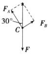BC 以结点$C$为研究对象,受力分析如图所示,其中$F = m_1g$、$F_B = m_2g$,由平衡条件可知$F_A = F\cos30^{\circ} = m_1g\cos30^{\circ}$,由几何关系可知$F_A = \frac{F_B}{\tan30^{\circ}}$,联立解得$m_1:m_2 = 2:1$,A错误,B正确;由以上分析可知,当沙桶(含沙子)$P$、$Q$质量的比值为$2$时,$AC$与$BC$保持垂直状态,$C$点的位置保持不变,而若在两桶内增加相同质量的沙子,则两沙桶(含沙子)质量的比值会小于$2$,则$Q$桶向下移动,$C$点的位置上升,C正确,D错误。故选BC。